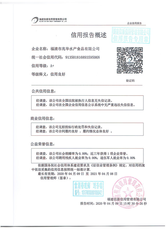 福清市兆華水產(chǎn)食品有限公司2020-4