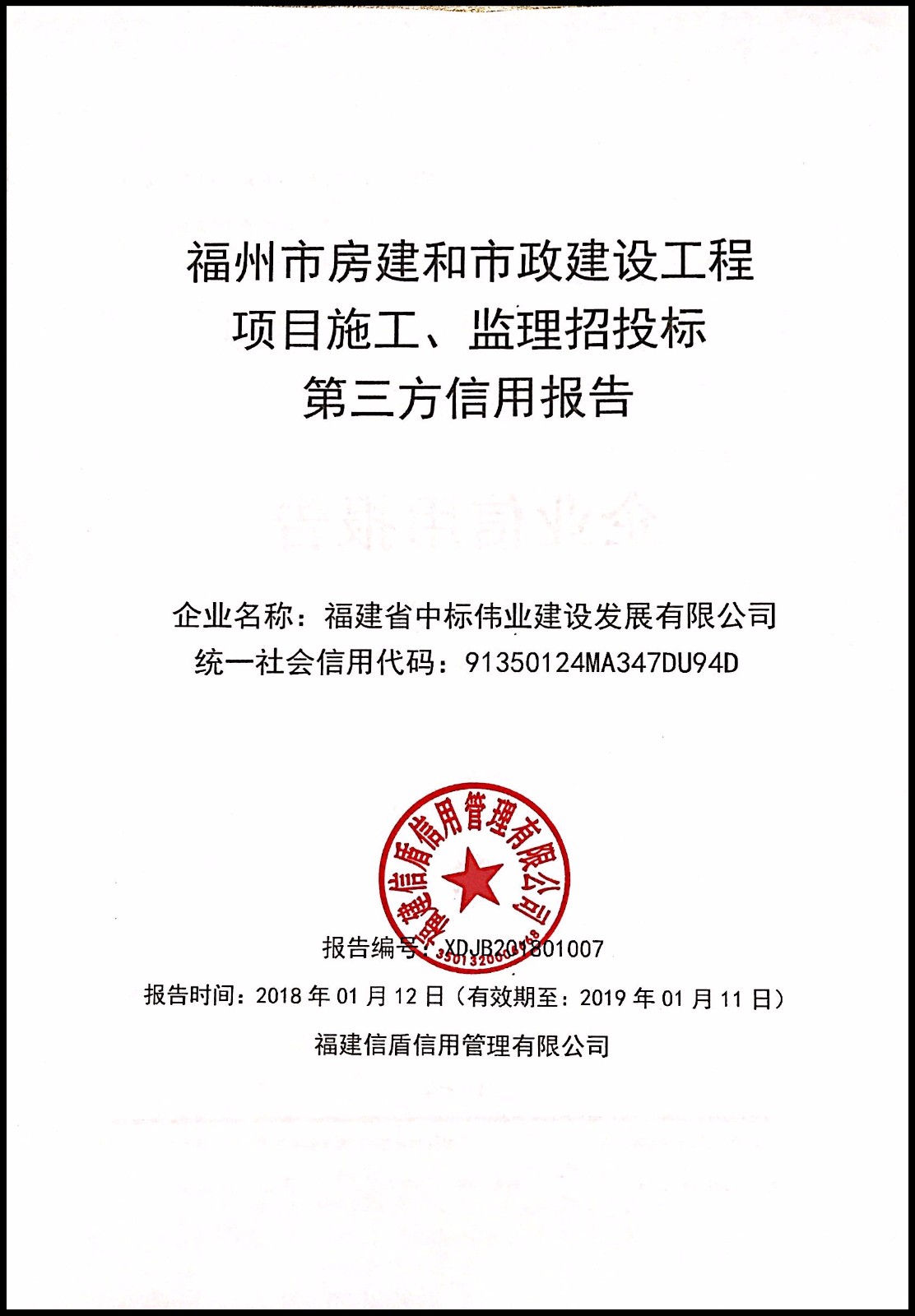 福建省中標偉業建設發展有限公司 XDJB201801007